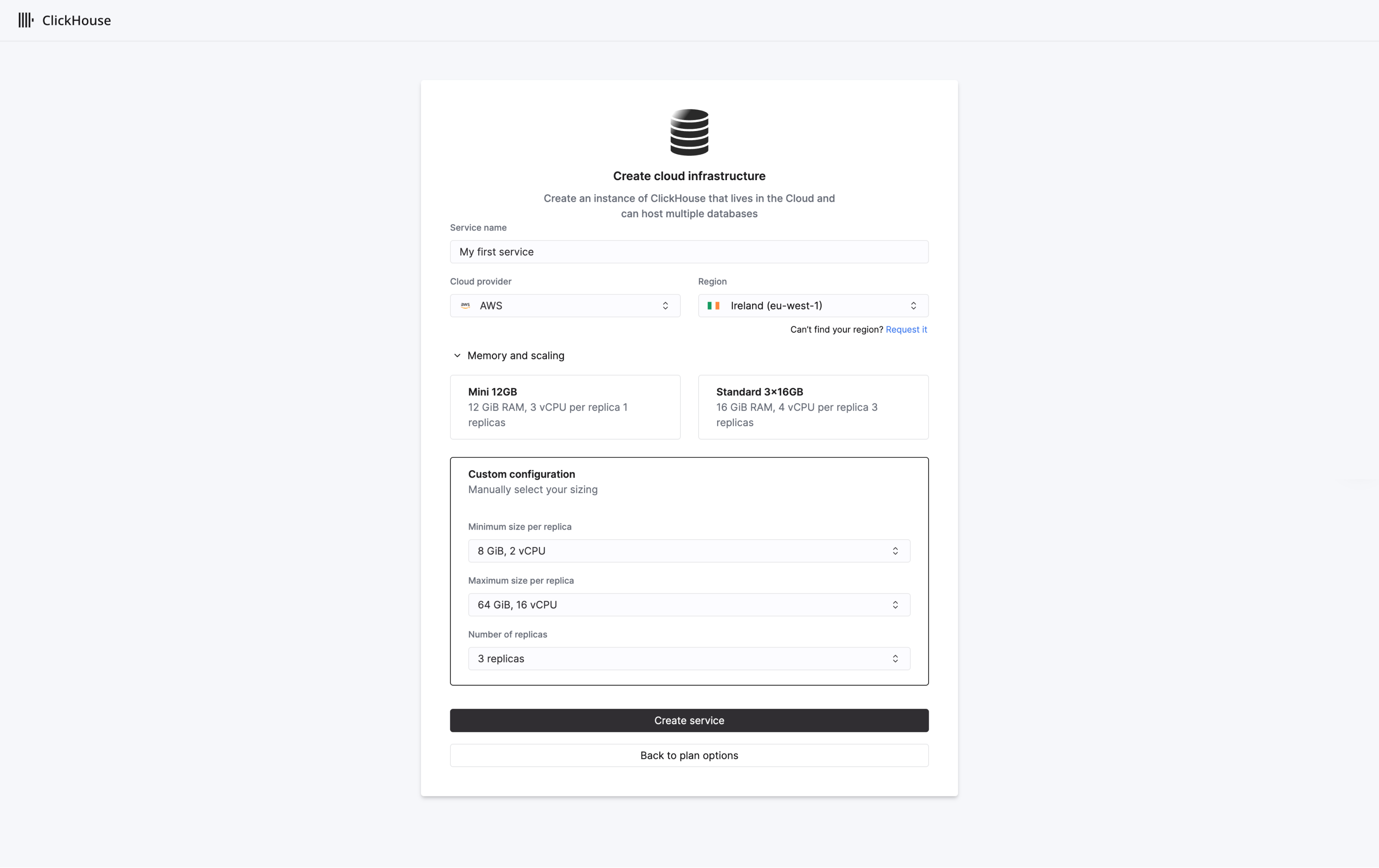 После входа в систему ClickHouse Cloud запускает мастер по началу работы, который проведет вас через процесс создания новой услуги ClickHouse. Вам будет предложено выбрать план: