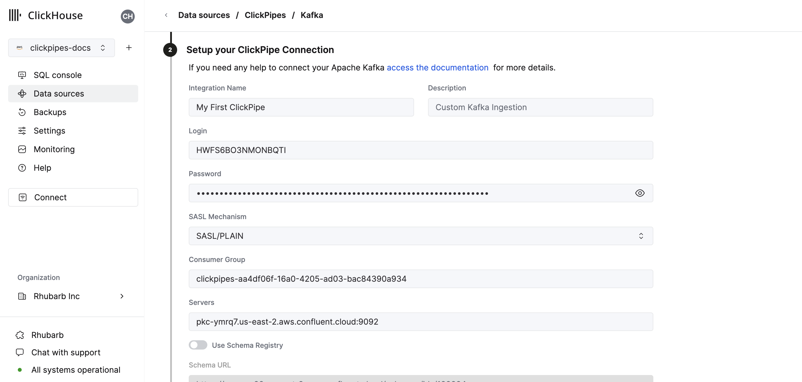 1. Заполните форму, указав название ClickPipe, описание (необязательно), ваши учетные данные и другие детали подключения.