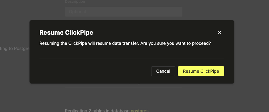 Существуют сценарии, в которых полезно приостановить Postgres ClickPipe. Например, вы можете захотеть провести анализ существующих данных в статическом состоянии. Или вы можете проводить обновления Postgres. Вот как вы можете приостановить и возобновить Postgres ClickPipe.
