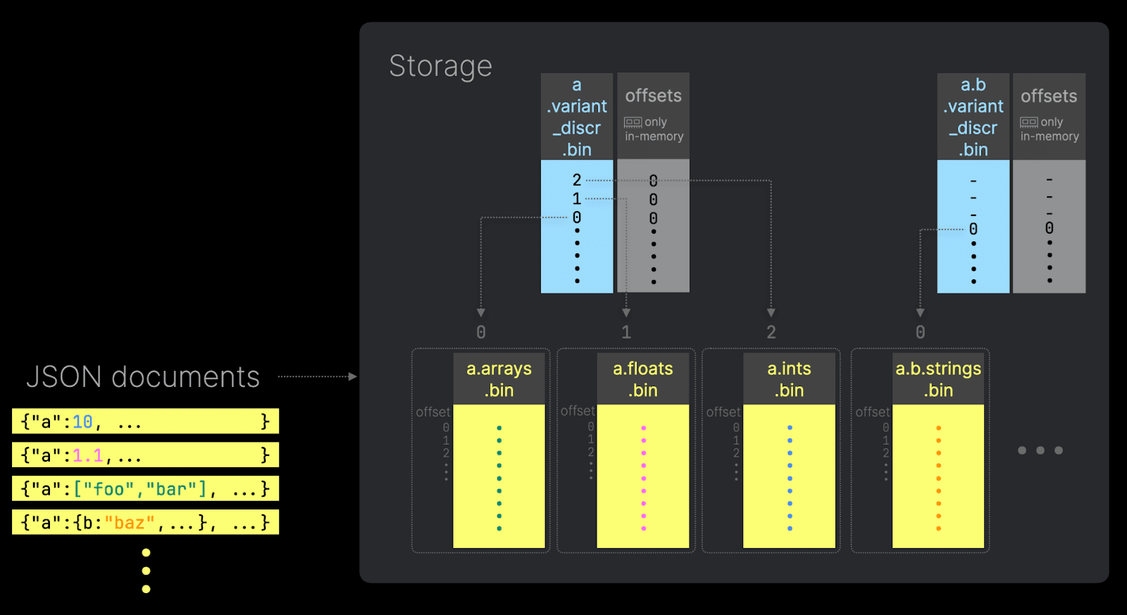 ClickHouse хранит каждый JSON путь как подколонку в истинной колонной раскладке, что позволяет получить те же преимущества производительности, которые наблюдаются с традиционными колонками, такие как сжатие, обработка с ускорением SIMD и минимальный ввод-вывод диска. Каждая уникальная комбинация пути и типа в ваших JSON данных может стать своим собственным файловым столбцом на диске.