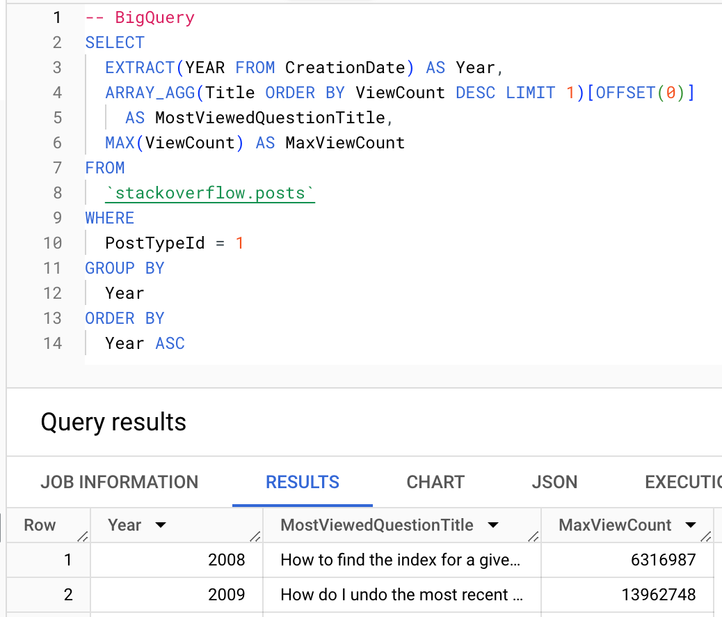 Следующее предоставляет примеры запросов для сравнения BigQuery и ClickHouse. Этот список нацелен на то, чтобы продемонстрировать, как использовать возможности ClickHouse для значительного упрощения запросов. Примеры здесь используют полный набор данных Stack Overflow (до апреля 2024).
